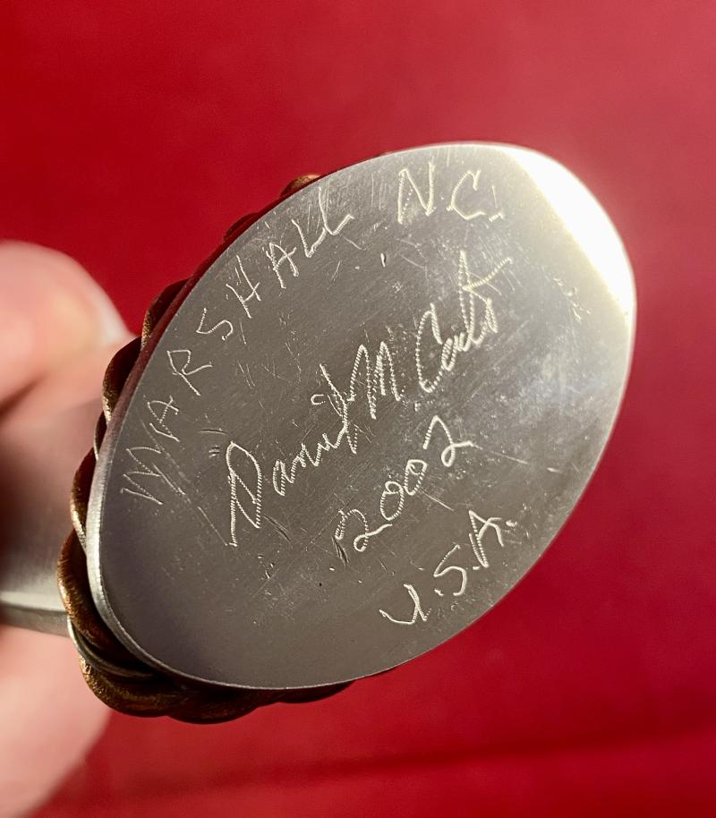 I acquired this knife along with two neck knives (item 52219) directly from Dan Certo, of DMC Originals in Marshall, NC, USA, back in 2002 and they have been in my collection ever since.