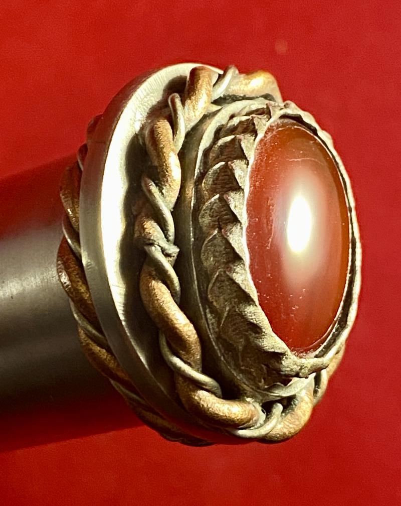 It has a D-2HC grade stainless steel cylindrical handle with twisted copper and stainless steel decoration around the crossguard and pommel. The pommel is topped with a genuine dark red oval Carnelian gemstone fitted in a sterling silver setting.