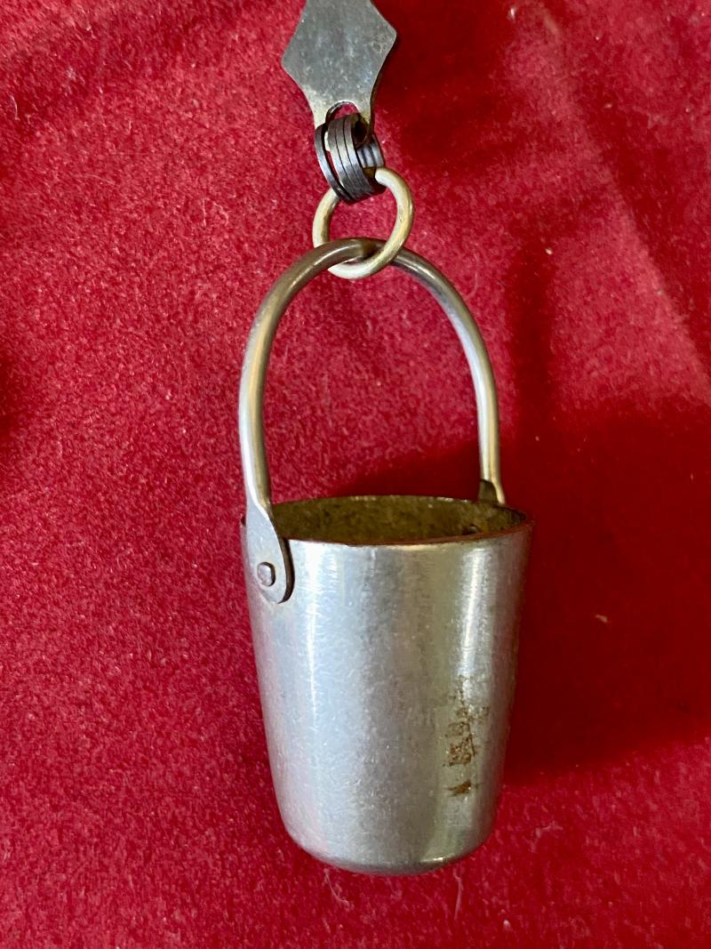 There is a metal thimble case in the form of a bucket that may originally have had a felt lining? Then there is also a period steel button hook. Finally, there is group of five small keys, one with a tag that reads: