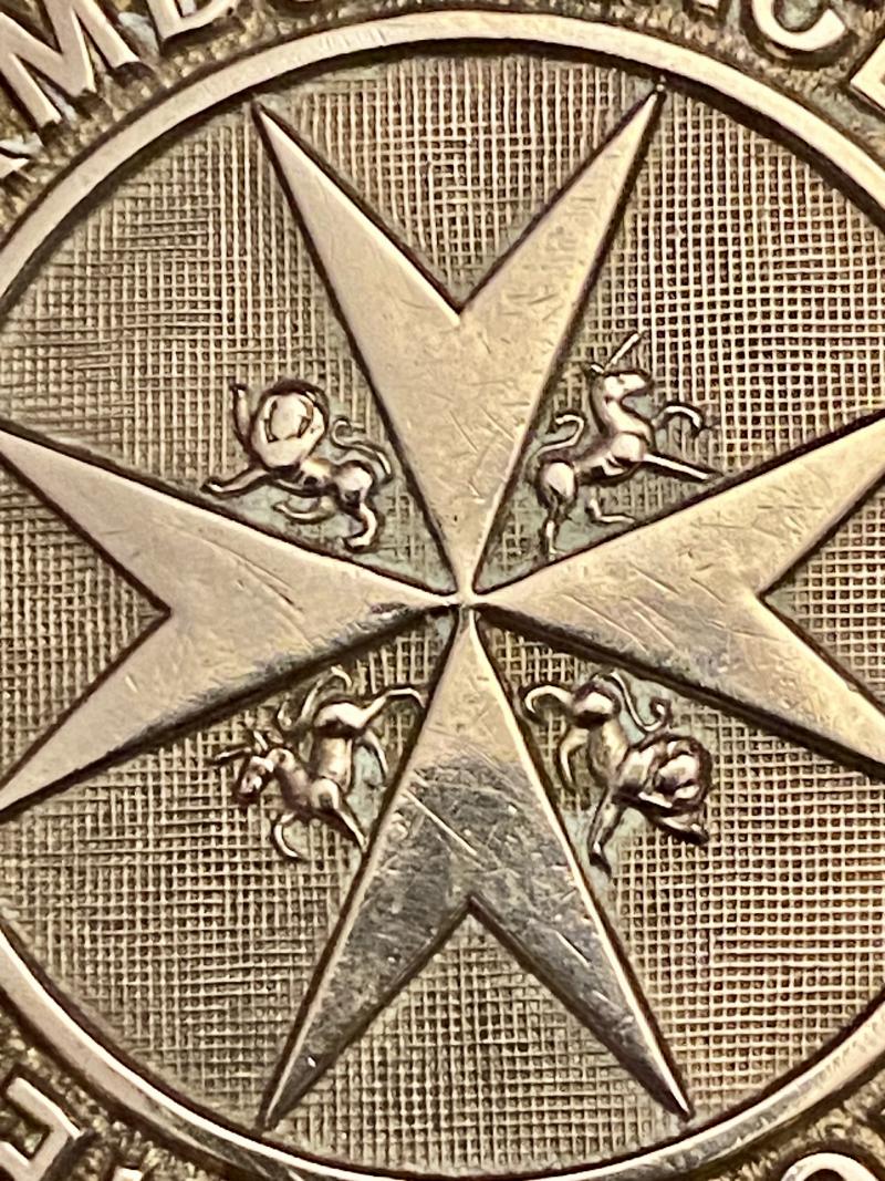 It depicts the logo, being a raised eight pointed Maltase Cross, with the lions and unicorns, surrounded by the words: