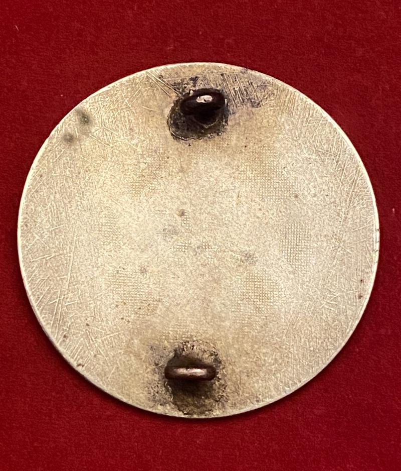 I believe this is an early version of this type of badge, being made of a solid metal construction, possibly nickel silver, given the polished finish to the front.