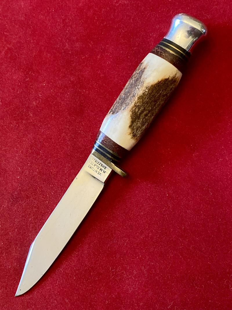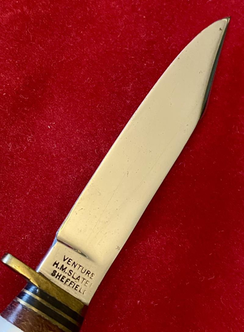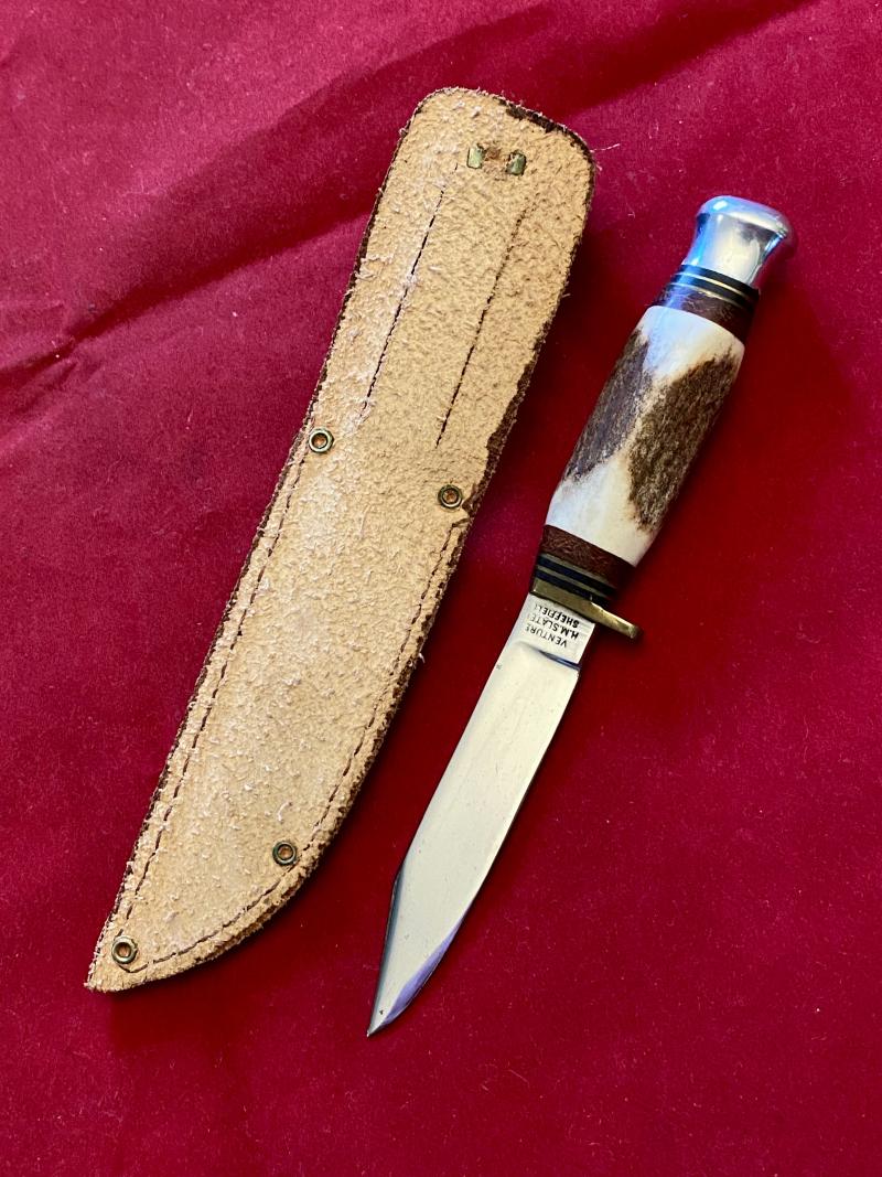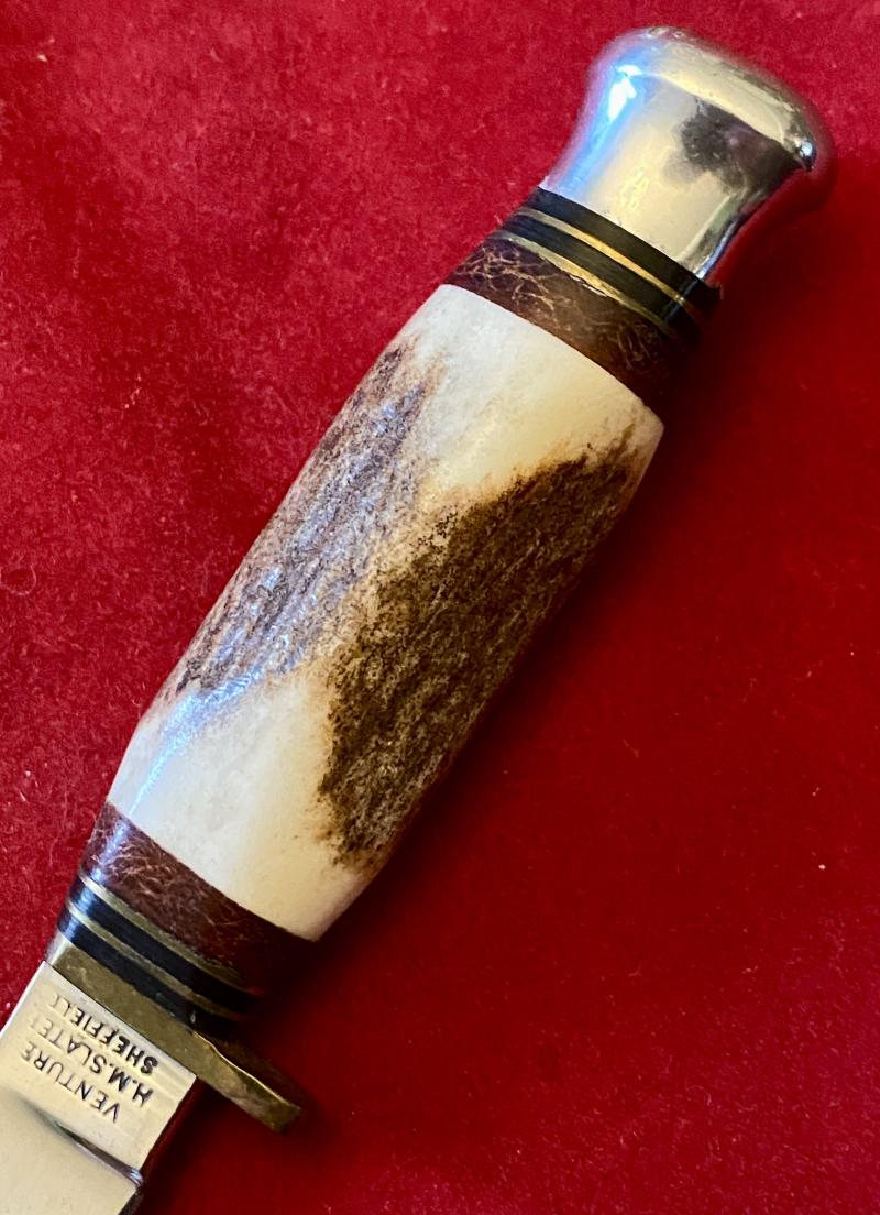 Here on offer is a mint example of a small VENTURE hunting bowie knife with a stag antler grip and leather sheath, made by H.M. Slater of Sheffield.