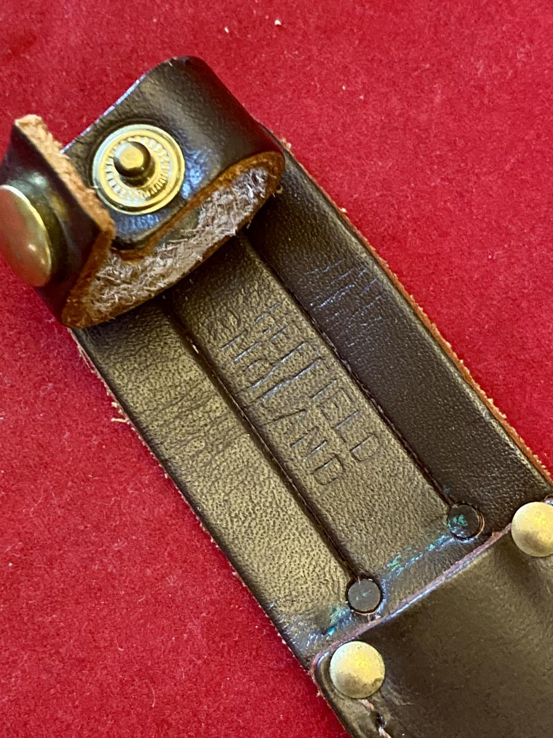 It comes with a leather stitched and riveted sheath, with a fastening strap and belt loop, that is stamped “SHEFFIELD ENGLAND”.