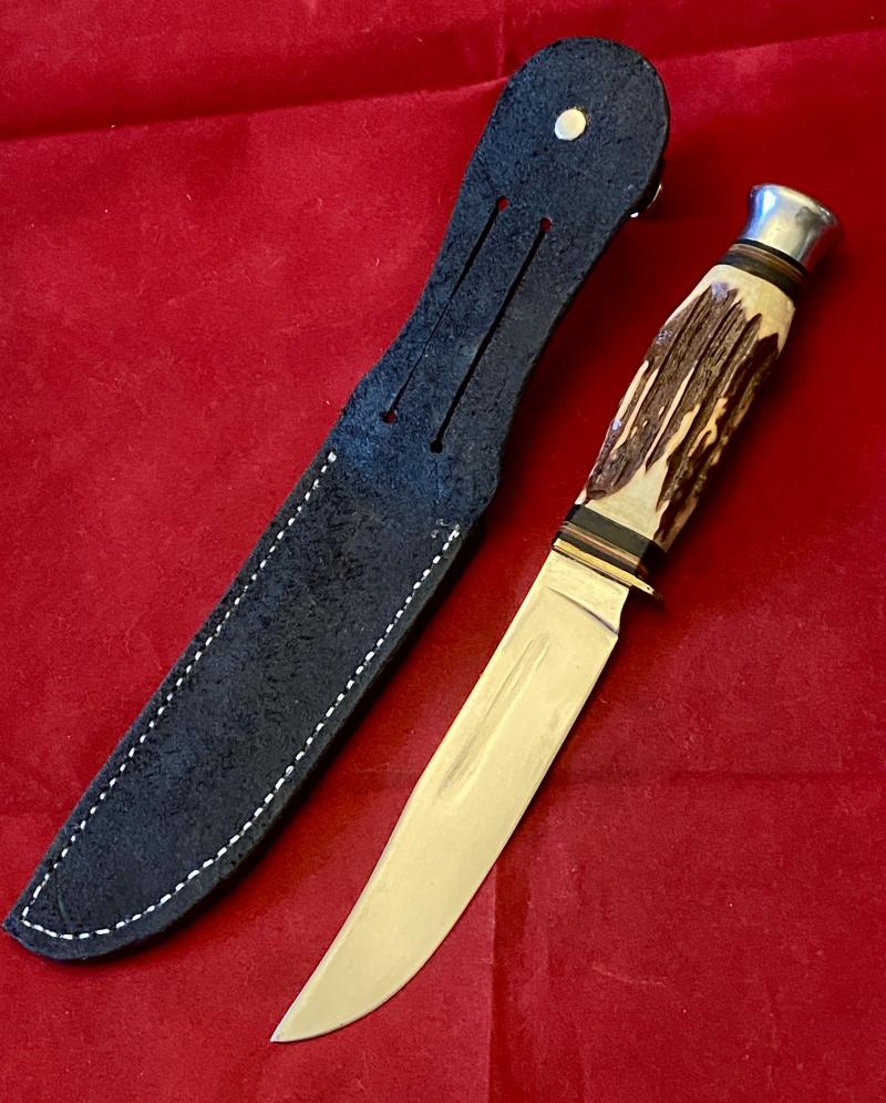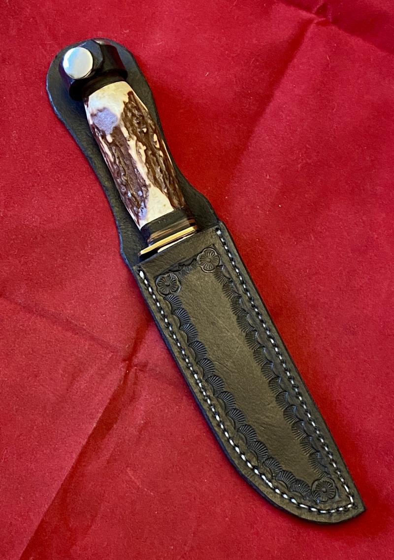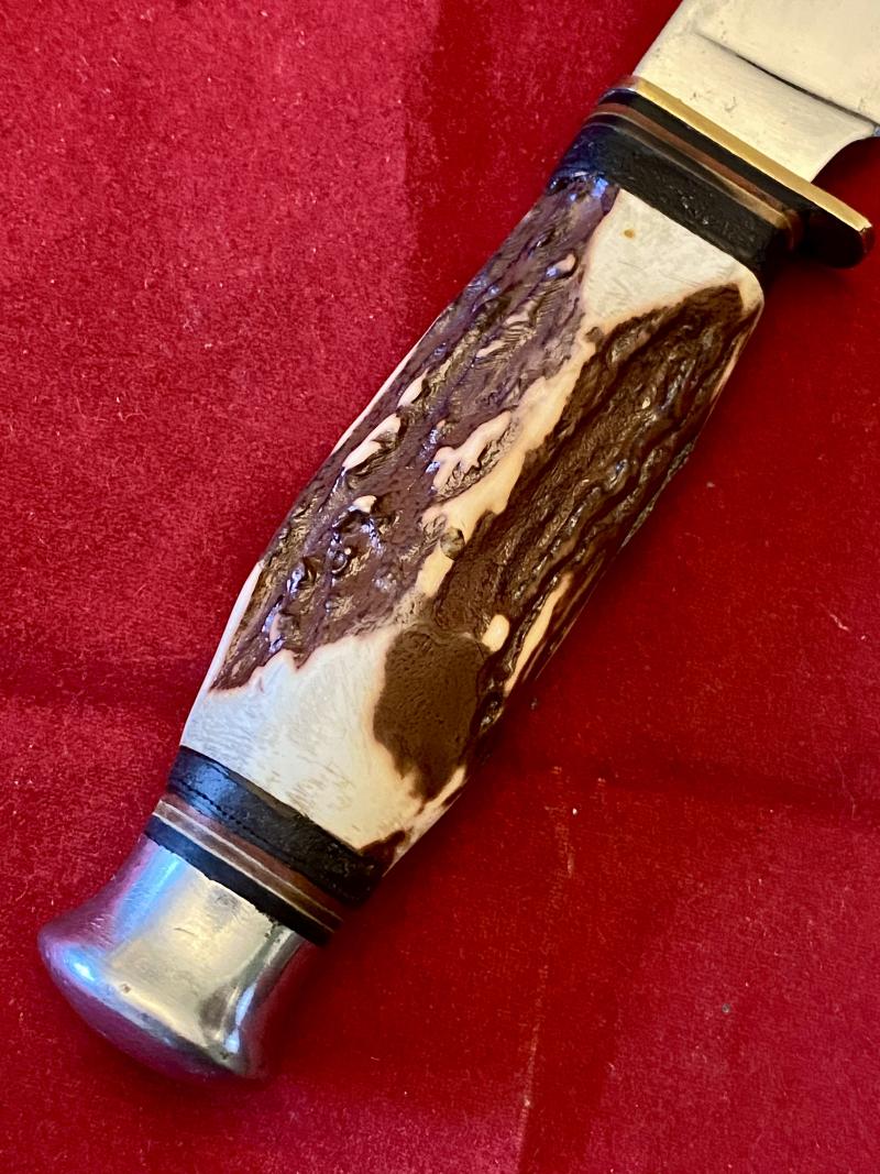 Here on offer is a fine, near mint hunting bowie knife with a faux (plastic) stag antler grip and handmade leather sheath.