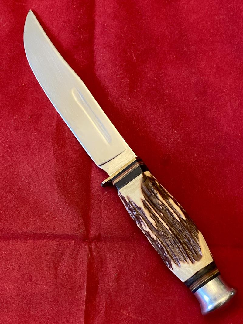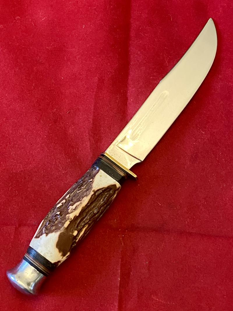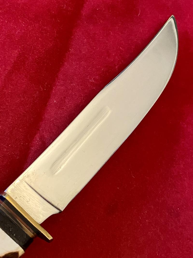 This bowie/hunting knife is in near mint condition and has a 5.2” highly polished steel blade.