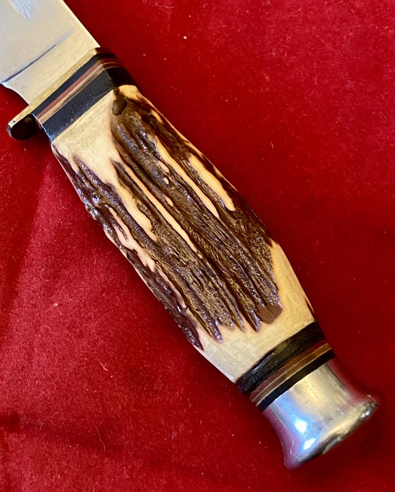 It has a brass single finger guard and brass and coloured red and black ringed spacers at both ends of the fine solid section of the really smooth and impressive stag antler.