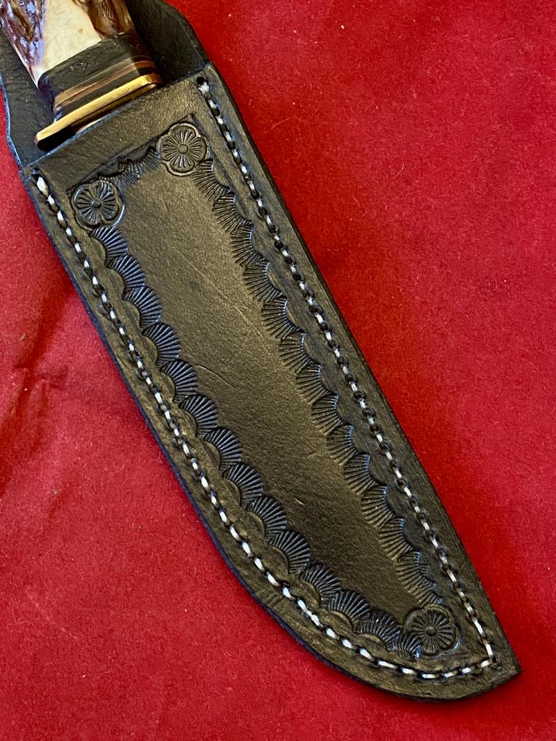 It comes with a custom handmade leather stitched and hand tooled sheath, with a fastening strap and belt loop.